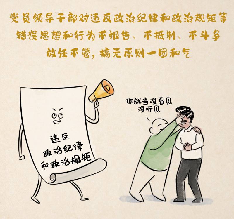 第七十五條 黨員領(lǐng)導(dǎo)干部對(duì)違反政治紀(jì)律和政治規(guī)矩等錯(cuò)誤思想和行為不報(bào)告、不抵制、不斗爭(zhēng),放任不管,搞無(wú)原則一團(tuán)和氣,造成不良影響的,給予警告或者嚴(yán)重警告處分;情節(jié)嚴(yán)重的,給予撤銷(xiāo)黨內(nèi)職務(wù)或者留黨察看處分。
