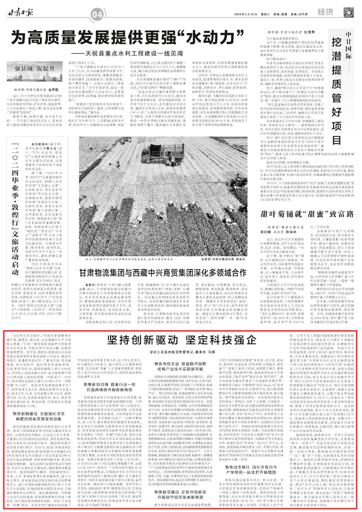 奮進新征程,建功新時代。甘肅工程咨詢集團將堅持和加強黨的全面領導,認真落實“兩個一以貫之”,以高質量黨建引領高質量發(fā)展,錨定建設先進科技創(chuàng)新體系、打造一流工程技術集團、推動建成高端咨詢智庫“三位一體”奮斗目標,全面建設現(xiàn)代科技創(chuàng)新企業(yè)。加快推進管理提升行動,持續(xù)深化管理標桿創(chuàng)建;加快推進價值創(chuàng)造行動,著力增強價值創(chuàng)造能力;加快推進品牌引領行動,不斷提升品牌運營管理水平;加快培養(yǎng)高層次人才,全力打造西北工程技術重要人才中心和創(chuàng)新高地;加快推進改革創(chuàng)新行動,推動“改革示范工程”更加突出科技屬性、“雙百企業(yè)”持續(xù)優(yōu)化公司治理;加快完善創(chuàng)新文化體系,激發(fā)提振干部職工創(chuàng)新創(chuàng)造活力。努力建設具有核心競爭力的一流工程技術產(chǎn)業(yè)集團,為推進中國式現(xiàn)代化甘肅實踐作出新的更大貢獻。